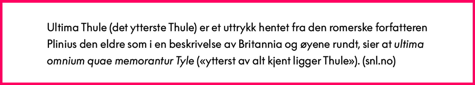Navnet peker mot Ultima Thule – «den ytterste utpost» – stedet der kartet slutter og det ukjente terrenget begynner. For oss handler det om å gå uopptråkkede stier, ikke for sin egen skyld, men nesten som metodisk utforskning.