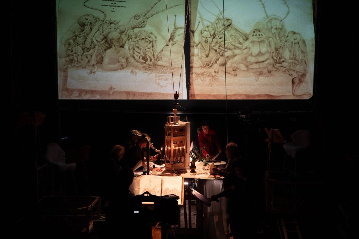 En stor, gammeldags bok spiller en sentral rolle i forestillingen. Med håndtegnede illustrasjoner, tykt papir og skrivemaskintekst rommer den Tore Vagn Lids lesedrama om kapteinen og hans skapninger. Boken er ikke bare rekvisitt, men i seg selv som aktør – et symbol på langsomt håndverk, omsorg og en rytme i kontrast til samtidens hastverk.